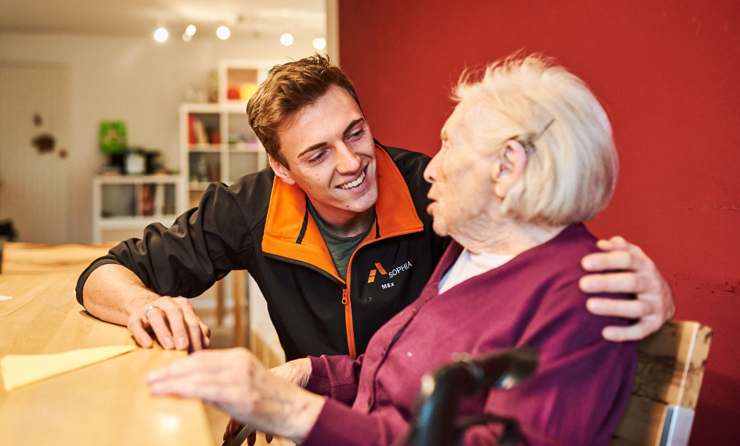 Betreuer unterhält sich mit älterer Frau in einer Tagesbetreuung